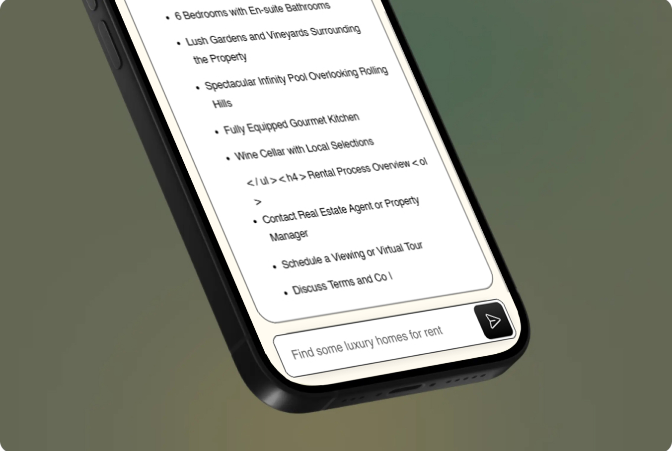 Conversation‑style support powered by your proprietary real‑estate knowledge bases.